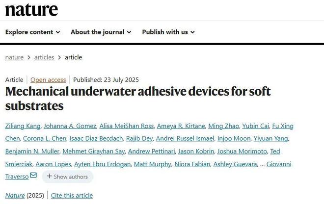 在这一背景下,麻省理工学院Giovanni Traverso教授课题组受自然启发,从鱼类“吸盘王者”——吸盘鱼(remora)身上汲取灵感,研发出全新一代机械式水下软组织黏附系统(MUSAS),突破性地实现了对动态软基底的强效、持久且无源黏附。吸盘鱼体表拥有特殊的黏附结构,能牢牢附着在各种海洋动物身上。为模仿这种独特能力,作者深入研究了它们的解剖结构、行为特征、物理机制以及仿生原理,尤其是它们如何在柔软表面上实现稳固吸附。通过这些研究,作者找到了吸盘鱼强力贴附的关键物理原理和进化机制,并将其成功运用到MUSAS的设计中。MUSAS展现出惊人的适应能力:无论是柔软、粗糙还是结构不稳定的表面,它都能牢固吸附,且贴附力和自身重量的比值高达1391倍。此外,它还能在极端酸碱环境和高湿度下保持优异性能。作者还验证了MUSAS在多种应用场景中的实用性,包括体外、离体及体内实验环境。例如,它可用于微型水下温度传感器、无创胃食管反流监测、长效抗病毒药物传输,以及通过消化道递送mRNA等前沿医学技术。相关成果以“Mechanical underwater adhesive devices for soft substrates”为题发表在《Nature》上,第一作者为中国学者Ziliang Kang。