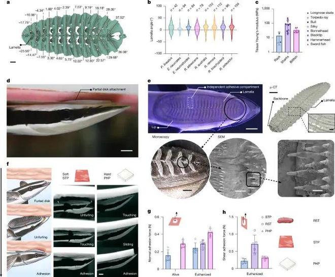吸盘鱼是一类能够依附于鲨鱼、鲸鱼、海龟甚至潜水员的神奇鱼类,其黏附盘是第一背鳍演化形成的复合结构。研究发现,这一结构包含层叠的“鳞板状”骨片(lamellae)和带钩的纤毛结构(spinules),并通过分隔舱室的形式形成独立的机械吸附单元。这一复杂结构,赋予其在软硬多种材质表面强效黏附的能力。作者对九种吸盘鱼的结构演化进行比对,发现其黏附能力与宿主游动速度、组织硬度紧密相关。例如专门附着在鲸类上的Remora australis,其吸盘骨片排列整齐、方向一致,有利于在高速水流中稳定吸附;而生活于鳐鱼口腔内的R. albescens,其骨片方向多样、结构柔软,更适应柔软复杂的生物内壁。研究团队进一步开展机械测试与高倍影像分析,首次揭示了吸盘鱼在软组织表面的“展开-抓取-分腔吸附”机制(图1a-h):通过吸盘展开、骨片挺立,形成多舱吸附结构,辅以微钩刺与软唇结构,实现在非完整接触下也可形成稳定负压与摩擦锁定。