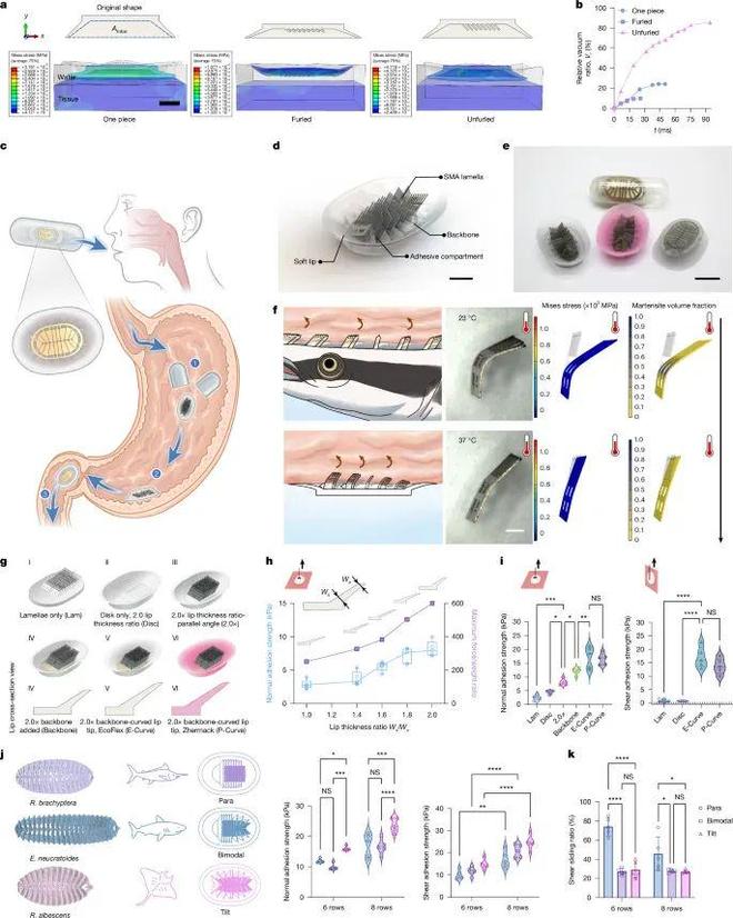 基于上述机制,研究团队设计了高度仿生的机械吸附系统MUSAS。该系统采用记忆合金材料制作倾斜骨片,搭配弹性体唇缘和不锈钢背板(图2a-f),形成多个独立的吸附舱室。整个装置封装在FDA最大规格(26mm×9.5mm)的胶囊中,具备在体温下自动展开、贴附并稳定驻留的能力。通过有限元仿线b)和实验对比,研究表明MUSAS中“展开多腔”结构可最大程度排出水分,形成强吸力;而骨片的倾斜多样性,是形成持久摩擦与适应软组织形变的关键。进一步测试表明,吸附力随骨片行数与角度多样性显著增强(图2j-k)。研究团队总结道,MUSAS正是R. albescens黏附策略的工程化再现,是迄今在水下软组织表面效果最稳定的无源仿生黏附系统。