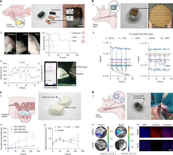 MUSAS不仅是强黏附平台,更是智能功能载体。研究团队展示了其在四大场景中的具体应用:水下无线a):结合无源RFID温度芯片,MUSAS可固定于游动中的罗非鱼表面,实时回传温度数据,最长保持110小时,助力生态研究与行为分析。胃食管反流病(GERD)非侵入监测(图5b):在猪体内,基于MUSAS的柔性阻抗传感器可精准识别胃酸反流事件,突破现有Bravo夹钳式装置的侵入与疼痛问题。3. HIV PrEP长效口服递送(图5c):将Cabotegravir长效药物加载至MUSAS载体中,可在体内持续释放7天以上,为口服PrEP提供切实可能。4.胃肠道mRNA疫苗递送(图5d):MUSAS作为微针递送平台,可将冷冻保存的脂质纳米颗粒mRNA高效释放于口腔与咽部,成功诱导萤火虫荧光素酶表达,是GI疫苗/基因治疗的突破性工具。