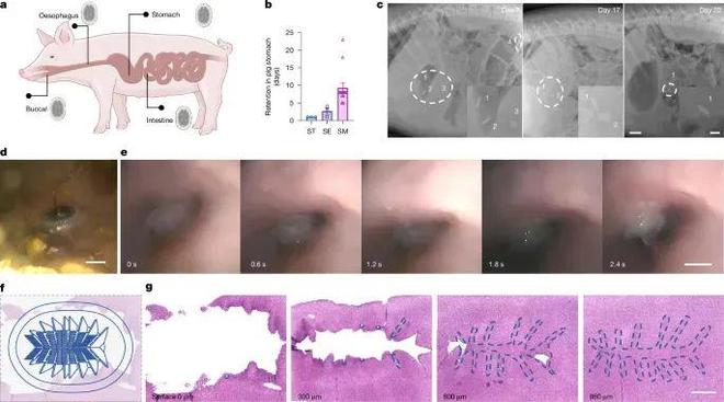 研究团队对MUSAS进行了为期数周的猪与鱼体内实验(图4a-c)。在胃内,MUSAS最长驻留达3.5周,期间不影响动物进食与活动;在鱼体表亦能稳定贴附数日,承受剧烈游动冲击。其自动展开机制依靠胃肠蠕动即可触发,无需外部电机或磁控,具备真实临床可行性。